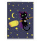 A black cat flies through the night on a witch's broom while wearing her hat! This design is perfect for Halloween decorations! Customise or personalise it by adding your own text or images.