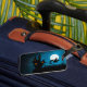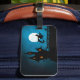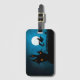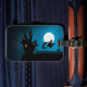 a witch flying on her broomstick past the full moon with a dark house in the background and a cat on the fence
