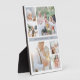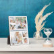 Chic photo collage plaque features six square photos (2 large, 4 small) arranged in a grid layout with a fog grey stripe running through the centre. Personalise with your custom caption, family name, and/or year. Ideal for displaying your photography portfolio or treasured family photos.