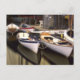 Fog surrounds four boats docked. postcard