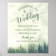 This beautiful sign is a simple way to welcome guests to your wedding celebration. It features a rustic yet elegant design with lacy script calligraphy on a backdrop of green mountain evergreen pine trees shrouded in mist or fog. Wonderful way to welcome your guests to your special day.