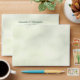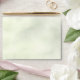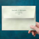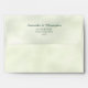 These wedding envelopes feature a rustic design with a marbled pale green outside, a pre-printed return address on the back flap, and a mountain scene inside the back flap of a mountainside covered with pine trees shrouded in mist or fog. Perfect for an outdoor or mountain themed wedding.