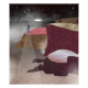 A beautiful landscape with unique textures showing a cliff side lighthouse and foggy night time ocean with a rising moon and starry sky in shades of red, pink, gold, silver, and blue.