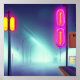 Foggy Street Flooded by light poles and neon signs