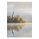Vertical photo print of a foggy sunrise on an early morning with mist over the water and reflection in the water of the church on the island in Lake Bled, Slovenia.