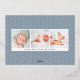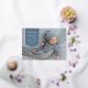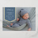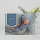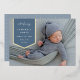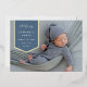 Simple modern birth announcement features a single full bleed horizontal or landscape orientated photo with a gold foil-trimmed banner at the upper left, bearing baby's name, birthdate, and birth stats. Add a personal message to the back, along with three additional square photos.