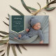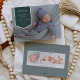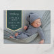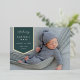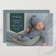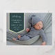 Simple modern birth announcement features a single full bleed horizontal or landscape orientated photo with a gold foil-trimmed banner at the upper left, bearing baby's name, birthdate, and birth stats. Add a personal message to the back, along with three additional square photos.