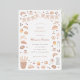 Café bébé baby shower foil invitations. Give your baby shower invitations a shine with real gold, silver, or rose gold foil. This french bakery-themed baby shower invite features a hand-painted frame of sweet treats, bread, and coffee. The illustrations include croissants, pan au chocolat, cinnamon rolls, pies, cake, cupcakes, baguettes, cherries, bows, coffee beans, and more, detailed with real foil. Ideal for a baby is brewing, Parisian patisserie, or coffee shop themed baby shower event. Cards reverse to vertical watercolor stripes in a warm brown color. View the collection linked on this page for matching items or visit our store for more baby shower invitations.