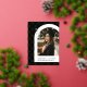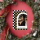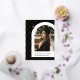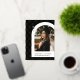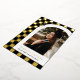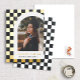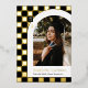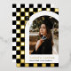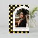 This modern and unique graduation announcement features a real gold foil and black chequered background highlighting a photograph of the graduate framed in a white arch with the graduate's name and school beneath. A small gradation cap is cleverly displayed in the checked background with the graduate's graduation year. The back has a fun matching checked pattern in white and black.