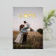 This minimalist Valentine's Day greeting card features a full-bleed photo, along with the phrase "Sending All Our Love". The sweet message is pressed in gold or silver foil, and combines a simple script font with a bold, hand-drawn typographic design. There is space for the customer to add their name and date at the bottom of the card. The back side of the card features a pattern of hearts made in the same style as the word "Love".