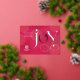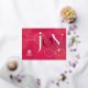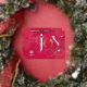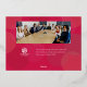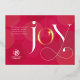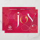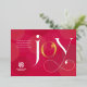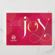 This brightly coloured business holiday card features a vivid magenta red background with the large word "joy" with a real gold foil o designed to look like a Christmas ornament. The front highlights a company logo and message of gratitude. The back features a company photo and logo and space for an additional message.
