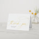 Simple and elegant 5x7 thank you cards feature "thank you" in modern hand lettered gold foil calligraphy script on a white background. Personalise with your custom text beneath; shown with "from the future Mrs. [name]". Add a pre-printed personal message to the inside.