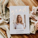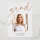 Customise this chic graduation announcement with a square photo overlaid on the word "GRAD" in rose gold foil script, along with your name, school, and graduation year. Add an additional photo and a personal message to the back.