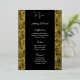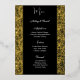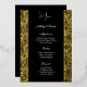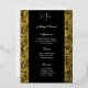 This wedding menu card is shown in an elegant black and gold foil floral print, script and standard text in a white colour.