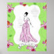 A vibrant floral print highlights a elegantly dress woman in a full lilac ballgown.