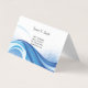This stylish folded business card is shown with a blue wave abstract art print.