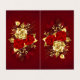 The composition of two artistically painted red roses and one golden rose, decorated with gold, jewel leaves on textured background.