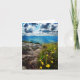 Folded greeting card with photo of mountain vista with clouds and flowers. Blank message.