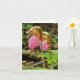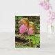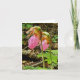 Folded greeting card with photo of pink lady's slipper orchids in forest setting. Blank message.