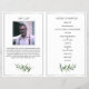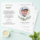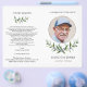 Featuring a half wreath of a peaceful olive branches, this watercolor graces a foldable funeral program. Designed to be printed on both sides and then folded at home, the front shows the name of the deceased and you can insert a favorite photograph into the silver effect circular frame whilst the inside can be edited with the order of service or whatever you wish. At a difficult time, this gracious greenery design with silver borders is suitable for a celebration of life service, a religious church memorial service or a humanist ceremony. The FAUX silver foil effect is printed and is NOT metallic.