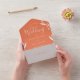A coral and white all-in-one wedding invitation. This invitation is decorated with white leaves and mixes minimalist and dramatic design. It includes the invitation as well as a tear-away RSVP card. Simply add your information, add this invite to your cart, and enjoy your beautiful wedding.