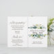 This foliage wedding program is perfect for a rustic wedding. The design features a boho frame of green leaves and leafy greenery botanicals. Include the name of the bride and groom, the wedding date and location, thank you message, order of service, bridal party and an "in loving memory" memorial.