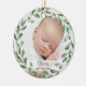 This beautiful Christmas holiday ornament for your baby's first Christmas features two of your favorite personal photos of your newborn baby, with a place to add their name. The edges are framed by a wreath of elegant green watercolor leaves, for a botanical design that will be a treasured keepsake.