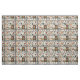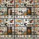 This fabric showcases a folk art quilt-inspired pattern with autumn and nature motifs arranged in rustic patchwork blocks. Pumpkins, oak leaves, floral branches, and birds—including a raven and pheasant-like bird—appear throughout, alongside stars, diamonds, and heart accents. Created in the style of appliqué and embroidery, the pattern uses warm earthy tones of orange, brown, red, green, and cream, evoking the spirit of fall. Perfect for farmhouse décor, primitive Americana style, harvest season crafts, and rustic folk art enthusiasts.