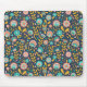 This folk art design features a pink, orange and teal floral pattern on a dark blue background.