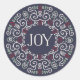 Chic and cheerful holiday design features "JOY" encircled by a folk art medallion illustration in ivory, cranberry and sage green, on a deep midnight blue background for a beautiful contrast.