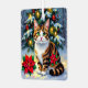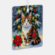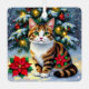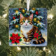 Cute Christmas cat themed ornament with a beautiful tabby cat with red poinsettias and snowy Christmas tree background. On the back you can add your own custom message.