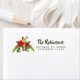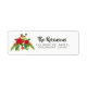 Cheerful and merry watercolor floral Christmas address label in bright holiday colours with cute little folk art bird and ornaments.