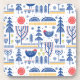 This folk art design features a woodland winter scene with birds, snowflakes and trees.