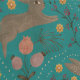 A whimsical pattern featuring leaping brown rabbits surrounded by yellow, pink, and red flowers, green leaves, and dotted accents on a teal background.