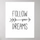 A trendy and motivational art print with a simple black typography quote with a hand-drawn arrow that says Follow Your Dreams.