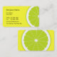 Food business cards in a bright and cheerful design that includes a graphic image of a lime on both sides and text space you can you can organise your way. Designed as a business card template for a food market, nutritionist, or fresh concept. Presented on high quality business card stock with rounded corners.