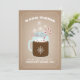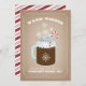 A Christmas card featuring an illustration of a mason jar of hot chocolate garnished with a candy cane and snowflakes. Background on front is card stock inspired. Background on reverse is red and white candy cane stripes. Personalize the text.