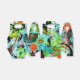 A lively abstract in shades of turquoise, teal, orange, red orange, black, white, metallic gold and shades of green.