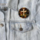 Large golden cross with jester hat and golden crown with typography design