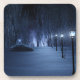 A snow-covered path meandering through the birch forest on a dark winter night. The way is lined with lampposts giving off a silvery blue glow, but in the shadows are bright, mesmerising shapes like little fairy lights, luring the traveller off the trail. In the distance the lavender glow of some mysterious forest gathering lights up the cold sky.