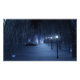 A snow-covered path meandering through the birch forest on a dark winter night. The way is lined with lampposts giving off a silvery blue glow, but in the shadows are bright, mesmerising shapes like little fairy lights, luring the traveller off the trail. In the distance the lavender glow of some mysterious forest gathering lights up the cold sky.