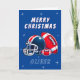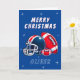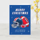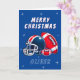Football Ball Helmet Cartoon Merry Christmas Card. Fun and modern football Christmas card. Featuring a bold cartoon illustration of a football and helmet in blue and red colours. Add your name.