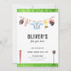This editable football first birthday party invitation sets the tone for your football theme birthday celebration. The EMMITT Collection features a white background with a watercolor american football and the green turf with yard lines along the top and bottom, along with a down indicator and down marker. A clothesline with football faves, from a football,wwhistle, cleats, helmet and trophy hand along the top. A pairing of sports sans serif, script and serif fonts in dark grey with all editable text completes this football kids birthday party invitation for a boy.