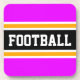 This sporty, colourful design features athletic FOOTBALL text inside a highlighted wide black stripe with white and yellow pinstripes against bright pink outer stripes. The text and colours in this design can be personalised.