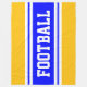 This sporty design features bold athletic FOOTBALL text inside wide bright royal blue and twin horizontal white racing stripes against orange yellow outer edges.