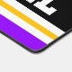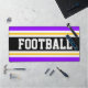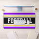This colourful, bold sporty design features athletic FOOTBALL text inside a wide centre black stripe adjoined with golden yellow, white, and bright vivid purple racing stripes. The colours and text in this design can be personalised.