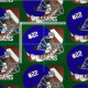 Football with dark blue football helmet and grey face guard. Offset pattern. Customisable white number on helmet and name. Green background. Colours of number, name and background can be changed after clicking on Customise it button.