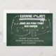 Get your squad ready for the main event with this "Game Plan" football party invitation! The design features a realistic green chalkboard texture background covered in classic white chalk football plays, Xs, and Os. The header reads "GAME PLAN" in a stencil font with a spray-paint style underline, followed by "JOIN US FOR THE BIG GAME."