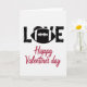 This greeting card features a stark white background with the word “LOVE” centered in distressed charcoal-black lettering, giving it a sporty, slightly rugged look. The “O” is replaced by a stylized American football in dark gray-black, detailed with white laces and a white stripe, adding a fun nod to game-day romance ❤️. The strong, worn texture of the black letters feels like it was stamped on, while the football sits neatly in line with the other letters to keep the layout balanced. Beneath the main word, “Happy Valentine’s day” appears in a flowing crimson cursive line, stretching across the lower portion like a soft ribbon of red 🥰. The contrast between the dark top text and the warm red message creates a sweet push-and-pull, like two people with different styles leaning toward each other. Plenty of open white space surrounds the design, making the black-and-red elements stand out without crowding. The football’s white laces and stripe are crisp and centered inside the “O” shape.
