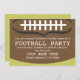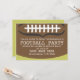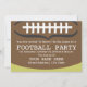 A football party invitation featuring an oversize illustration of a football covering most of the surface of invitation. Background at bottom and on reverse is green, but can be customised. Text is white.